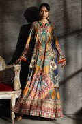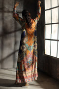 A statement piece that exudes effortless charm — this velvet kaftan features colorful printed motifs and a delicately embroidered neckline for a refined finish.