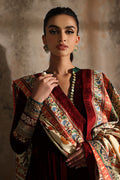 This maroon velvet long Peshwas with lace-detailed sleeves is paired with a velvet lehenga and a stunning velvet shawl, creating a luxurious ensemble perfect for any celebration.
