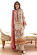 A graceful outfit featuring intricate floral embroidery with delicate printed motifs. The red lace-edged dupatta adds charm, paired with matching printed trousers for a complete festive look.