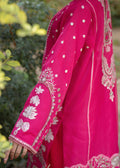 A vibrant hot pink long shirt and trouser set, beautifully embroidered with intricate ivory thread work. The classic combination of the bold pink hue and delicate ivory embroidery creates a stunning visual effect. Paired with the set is an elegant organza dupatta, framed with a lovely border that adds a touch of sophistication and refinement to the overall ensemble.