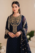"Erina" is a breathtaking ensemble crafted from deep blue muskaish chiffon. It features delicate hand embellishments, intricate embroidery, and shimmering light gold sequins. The look is beautifully complemented by Russian grip trousers with an embroidered border, perfectly balancing the richness of the chiffon dupatta. This exquisite outfit is an ideal choice for Eid celebrations.