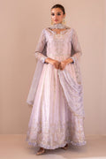 Parinaaz is a captivating blend of traditional and modern styles, featuring pastel hues in a stunning lilac and powder pink dress. The embroidered bodice and sleeves are beautifully adorned with sequins and embroidery work. This ensemble is paired with a shaded chiffon dupatta, showcasing detailed embroidery, and tonal raw silk trousers.