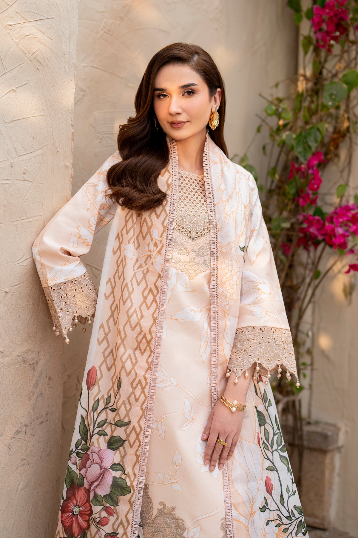 Kaai in soft pink is a poetic tribute to the delicate charm of spring. This digitally printed lawn embroidered outfit features a beautifully detailed front and sleeves, enhanced with matching cutwork. Paired with printed lawn trousers and a digitally printed voile dupatta, it captures the essence of the season’s softness in every thread.