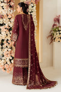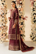 The Salsa ensemble features a luxurious maroon raw silk outfit, adorned with intricate copper-gold threadwork and shimmering sequins. It is complemented by a delicately embroidered chiffon dupatta, ideal for both traditional and contemporary draping styles, paired with elegantly embroidered raw silk trousers, adding a sophisticated touch.