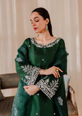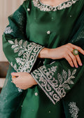 A beautiful organza bottle green ankle-length shirt, intricately embellished with dabka, nakshi, and pearls. Features bell-bottom sleeves with a heavily hand-worked border. An ideal pick for the festive season! It comes with a silver block-printed dupatta to complete the look.