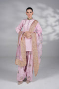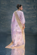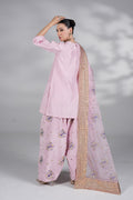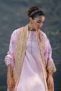 Premium silk shirt with hand embellishments, farshi shalwar with intricate handwork, and chiffon dupatta – a lilac dream for festive evenings.