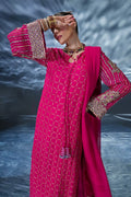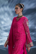 Shocking pink embroidered chiffon suit with handwork sleeves, Premium Raw Silk trouser & chiffon dupatta with lace detailing.