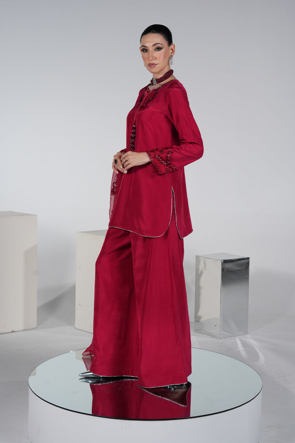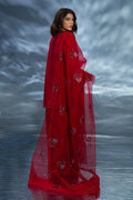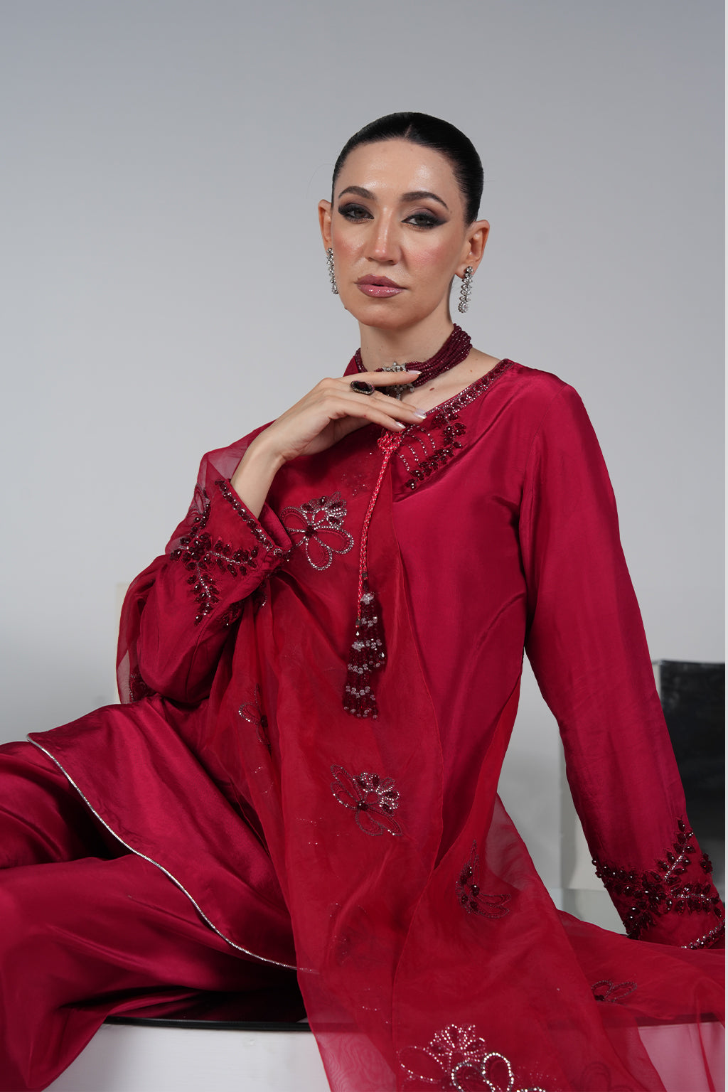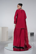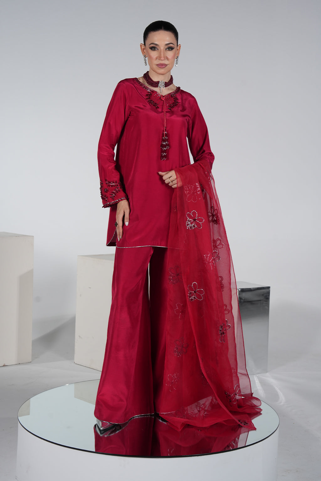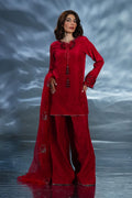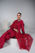 Red premium silk shirt with embroidered neckline & hand-embellished sleeves, paired with silk plazo pant and organza handwork dupatta – a bestseller for festive glam