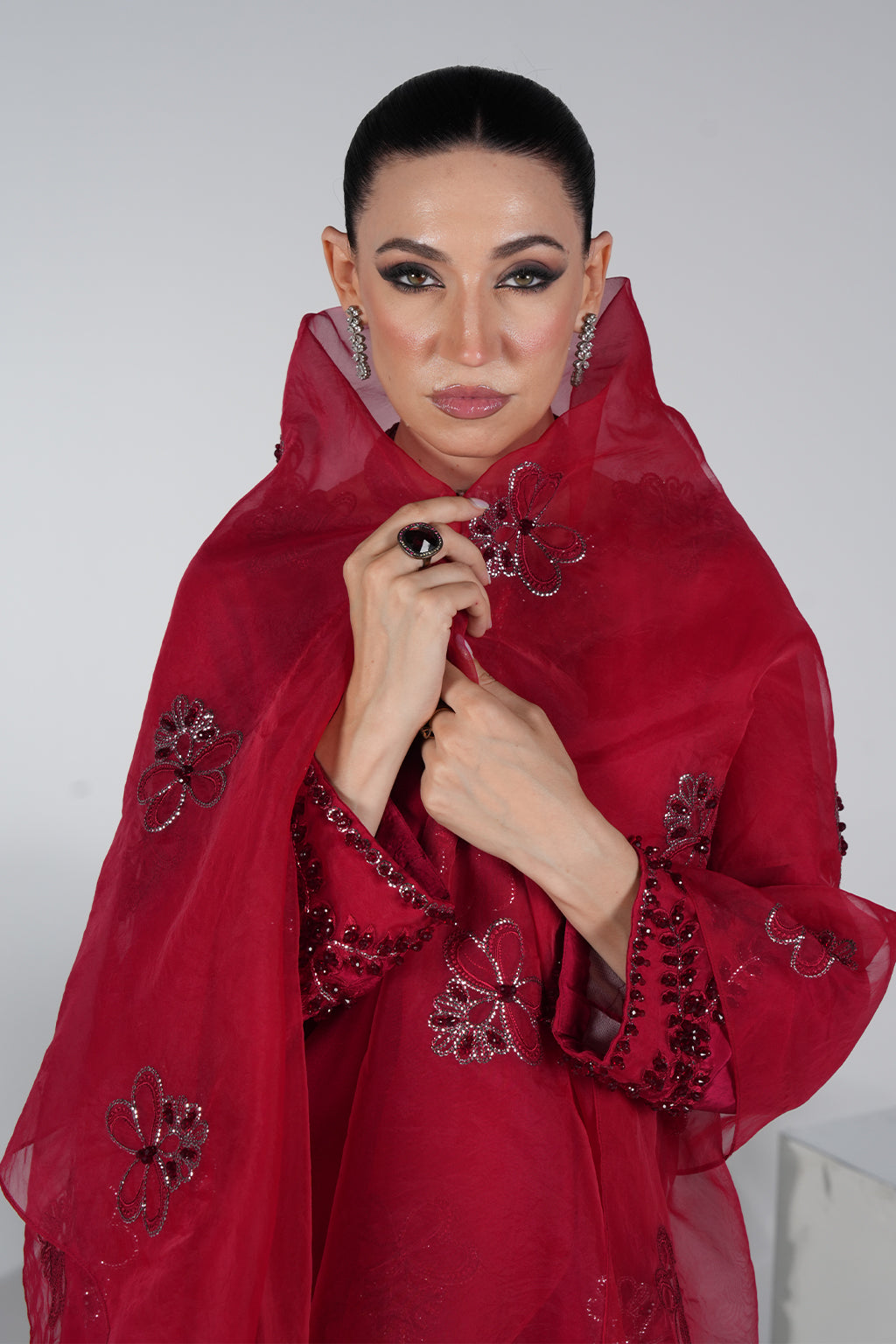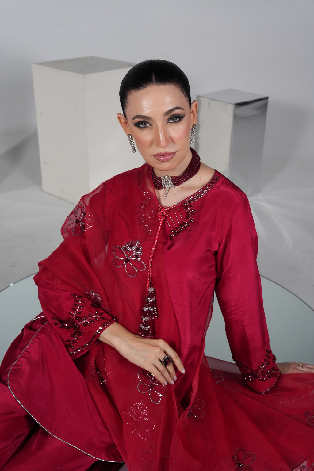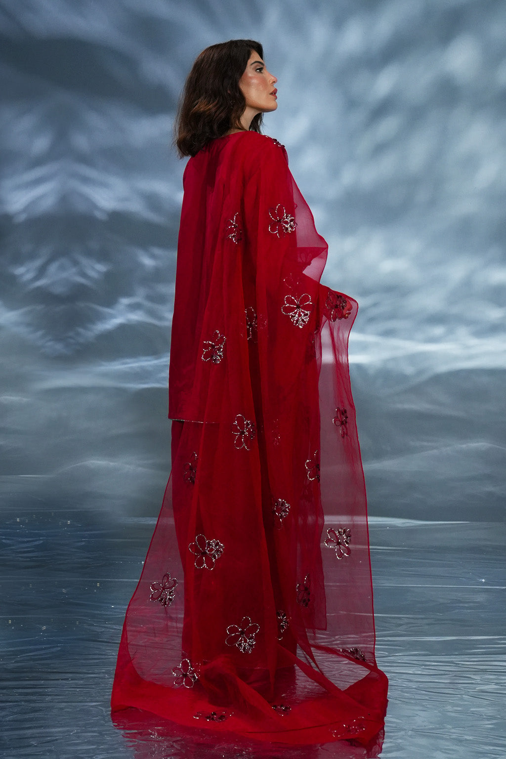 Red premium silk shirt with embroidered neckline & hand-embellished sleeves, paired with silk plazo pant and organza handwork dupatta – a bestseller for festive glam