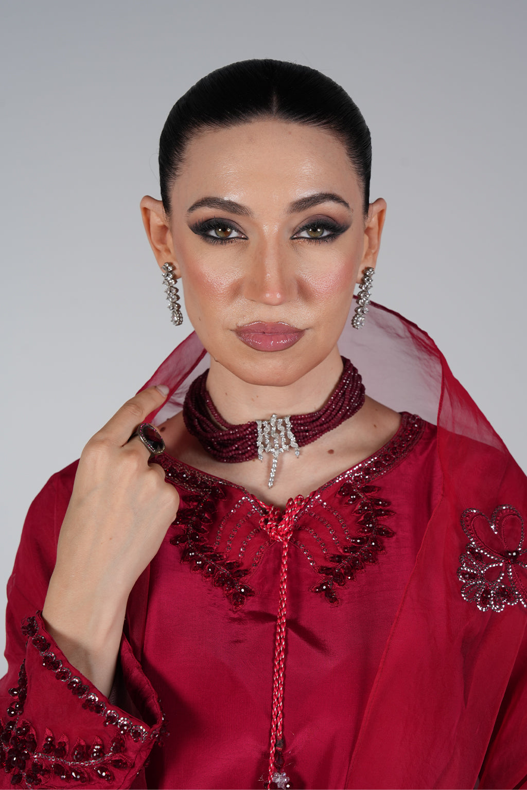 Shirt: Red silk shirt with embroidered neckline and hand-embellished sleeves, finished with fine detailing