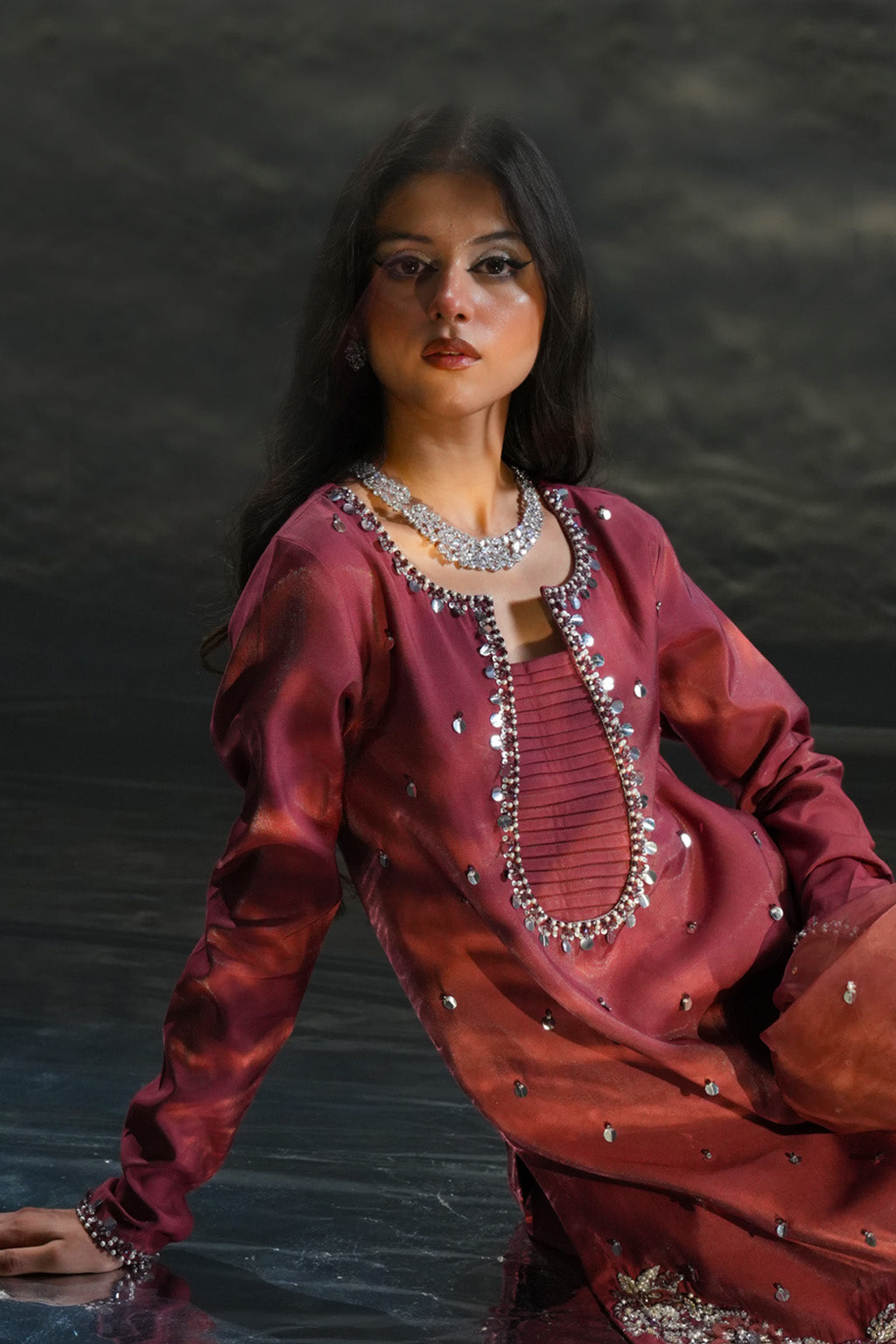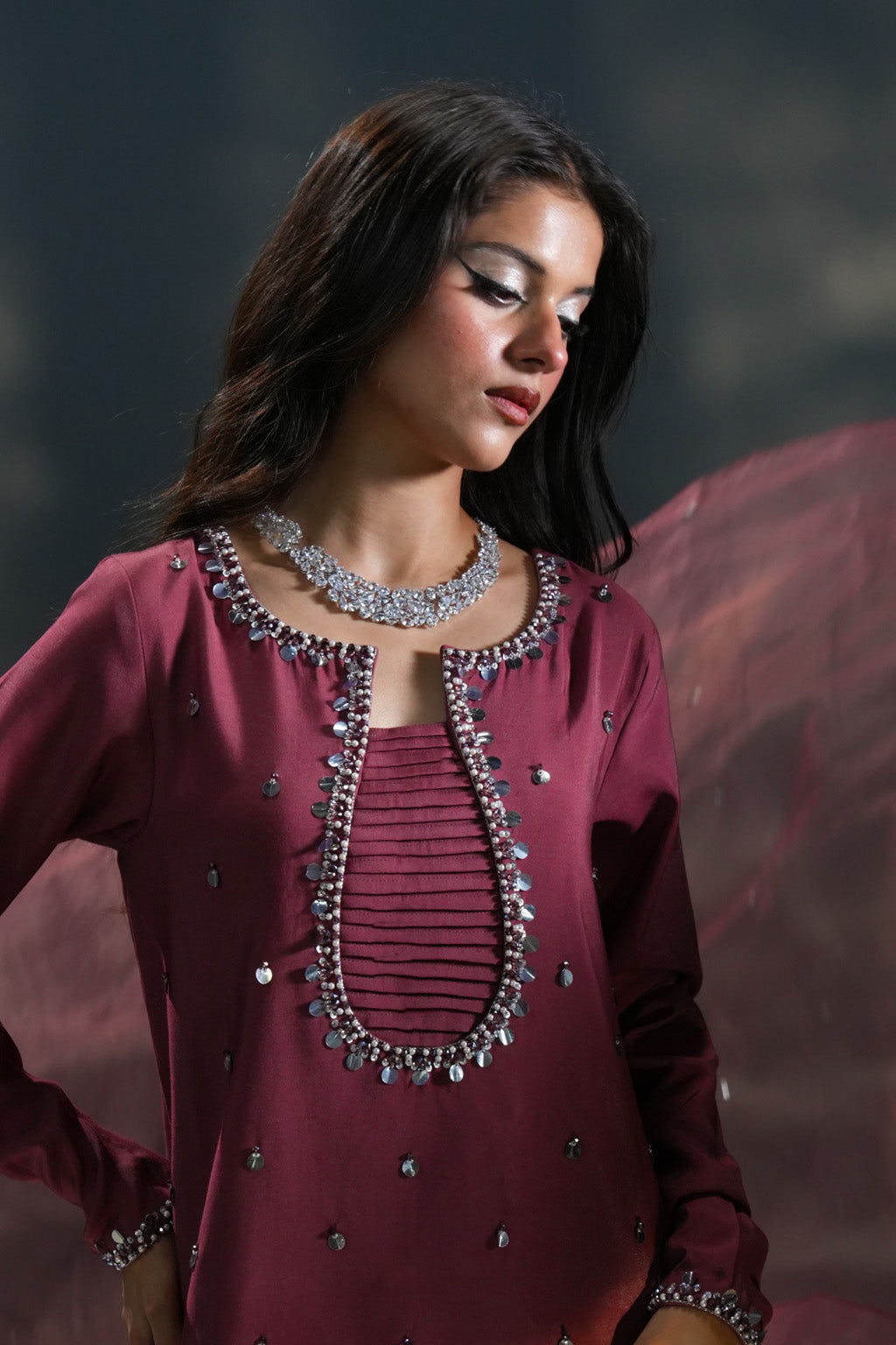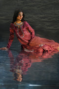 Brown premium silk shirt with hand embellishments, farshi shalwar & organza dupatta with handwork detailing.