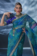 Embroidered premium silk blouse with handwork, printed organza pallu with embroidered border & premium silk paiti coat.