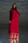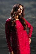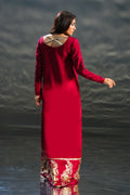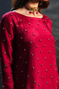 Luxurious deep maroon maxi-shirt in premium silk with handwork & embroidered border, completed with silk trouser.