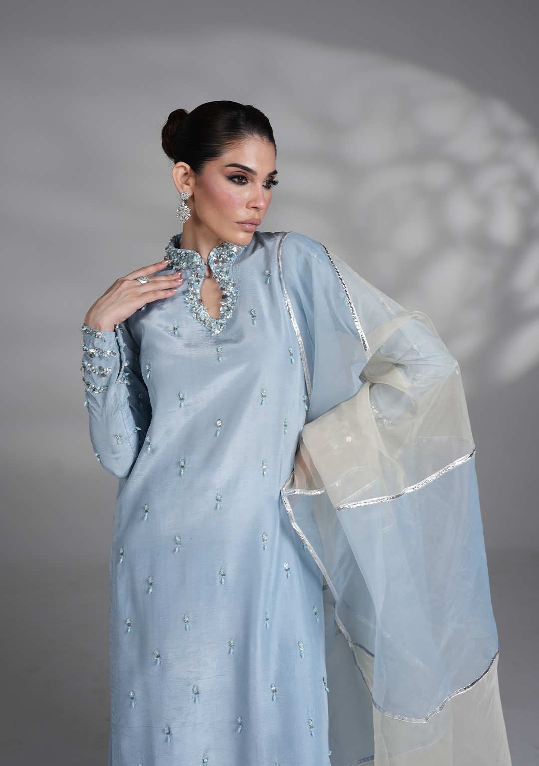 A ice blue premium silk long shirt featuring embellished details for a hint of sparkle, paired with matching premium silk straight pants & organza two color blocks dupatta.