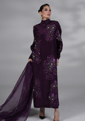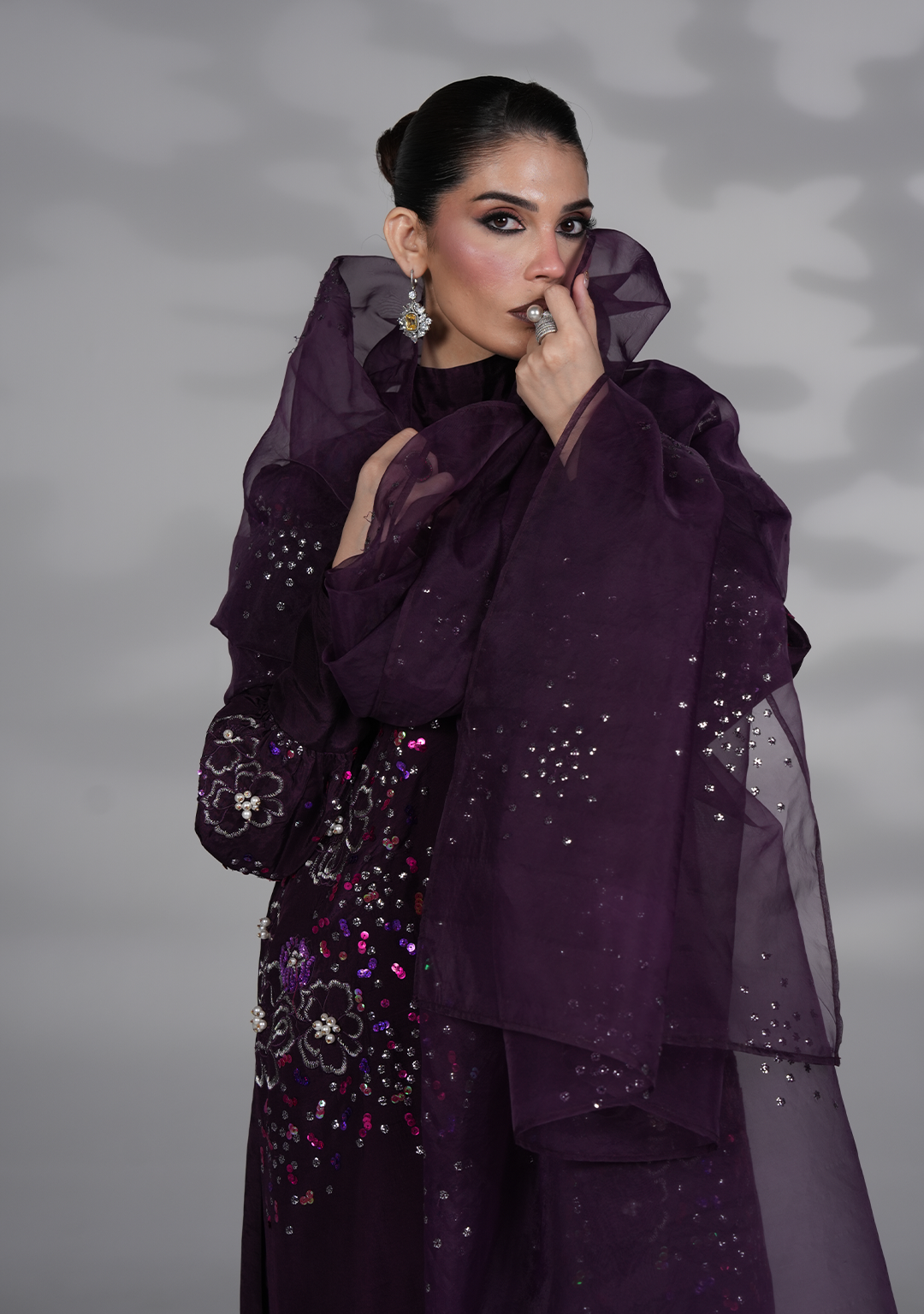A purple long shirt with delicate hand embellishments and embroidery, paired with plazo pants and embroidered organza dupatta