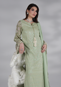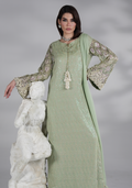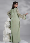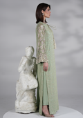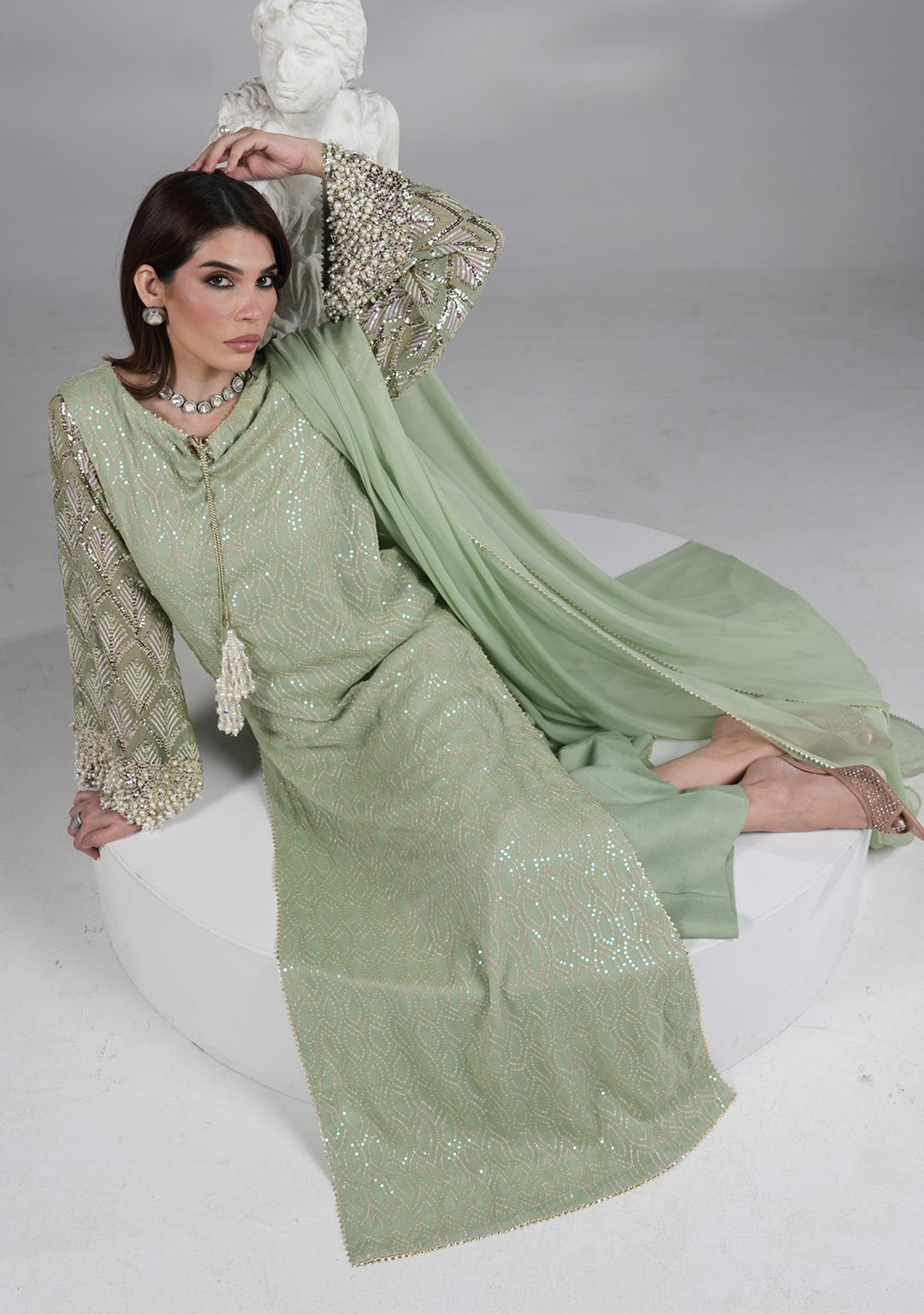 A mint green embroidered long shirt with delicate embellished sleeves, hand made dori tassles neckline, paired with plazo pants and chiffon dupatta with lace detailings.