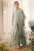 Soothing shade of ice blue on pure silk net zari canvas featuring ruffled neckline adorned with laces and handcrafted zardozi motifs. The hemline of kalidaar is adorned with layers of laces, sequined embroidered organza and silk thread embroidered details adorned with dabka, nakshi and light catching crystals. The outfit is paired with designed organza dupatta with laces, block print and gota details and comes with raw silk designer pants featuring pleats and lace details.