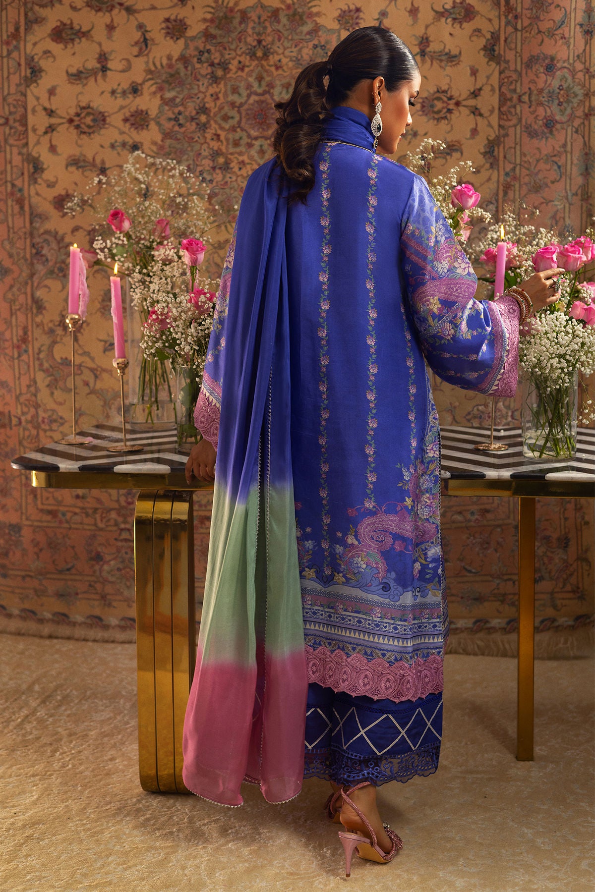 Crafted from exquisite pure raw silk in stunning shades of blue and lilac, this outfit showcases intricate zardozi embroidery along the neckline, embellished with pearls and gota. The hem is further enhanced by an embroidered panel. Accompanying this ensemble is a complimentary raw silk izaar, adorned with gota details and an embroidered panel at the hem. Additionally, the outfit is complemented by a luxurious ombre dupatta, culminating in a striking and unforgettable appearance.