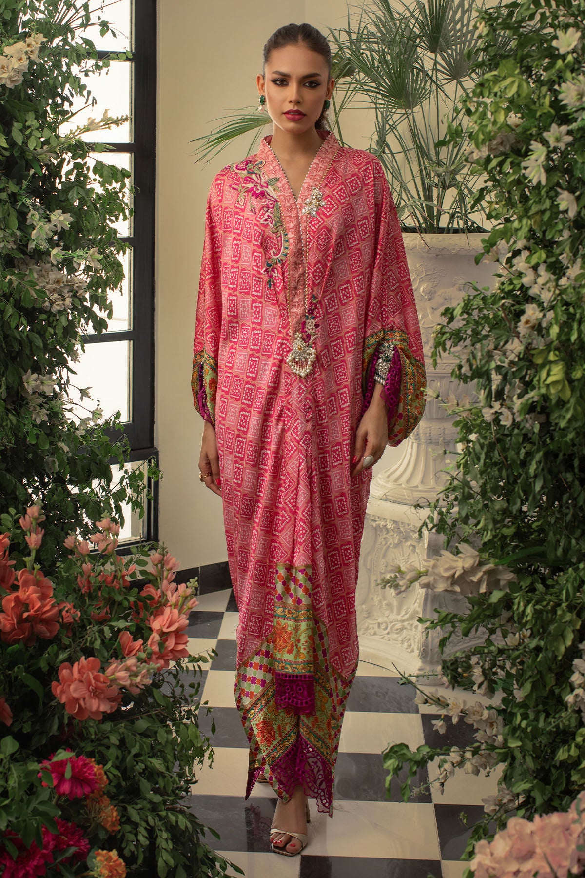 Long silhouette kaftan featuring chunri prints adorned with silk thread embroidered details on neckline. The sleeves are adorned with zardozi and light catching dangling crystals. The hemline is finished with schiffli details.