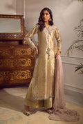 Long silhouette shirt crafted from deep gold lame canvas, featuring understated silk thread rosettes elegantly embellished with all silver zardozi intricacies. The neckline is accentuated with artisanal tassels, while the hem showcases exquisite scallop detailing. This distinguished shirt can be complemented with loosely tailored damask trousers and a pastel pink net dupatta, adorned with sequins and delicately finished with lace.