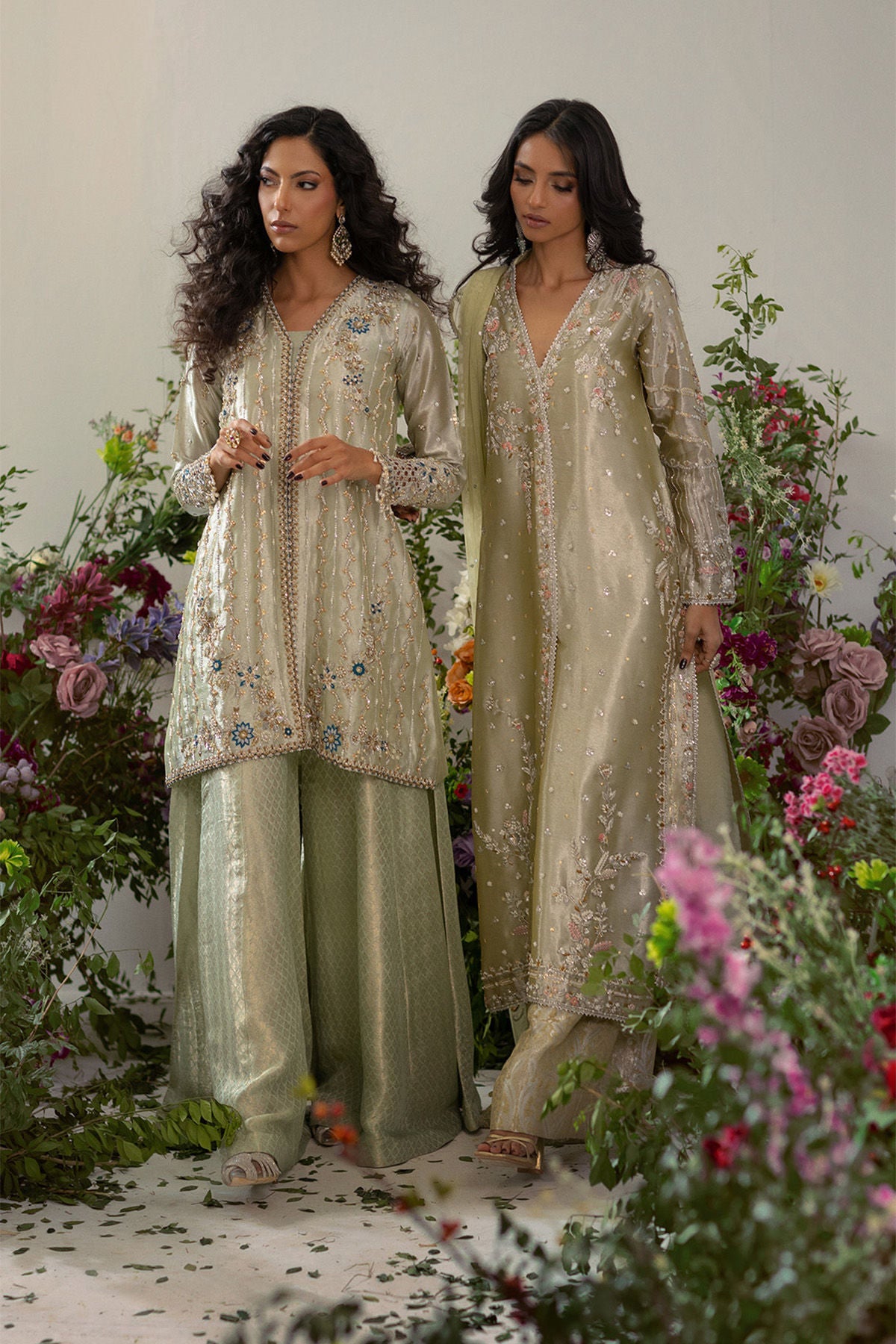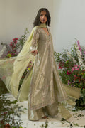 Long silhouette A line Angharka in olive gold shade featuring intricate silver and gold zardozi details. The angharka is paired with flared damask pants and a net dupatta featuring appliqué zari motifs on each pallu.
