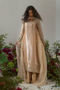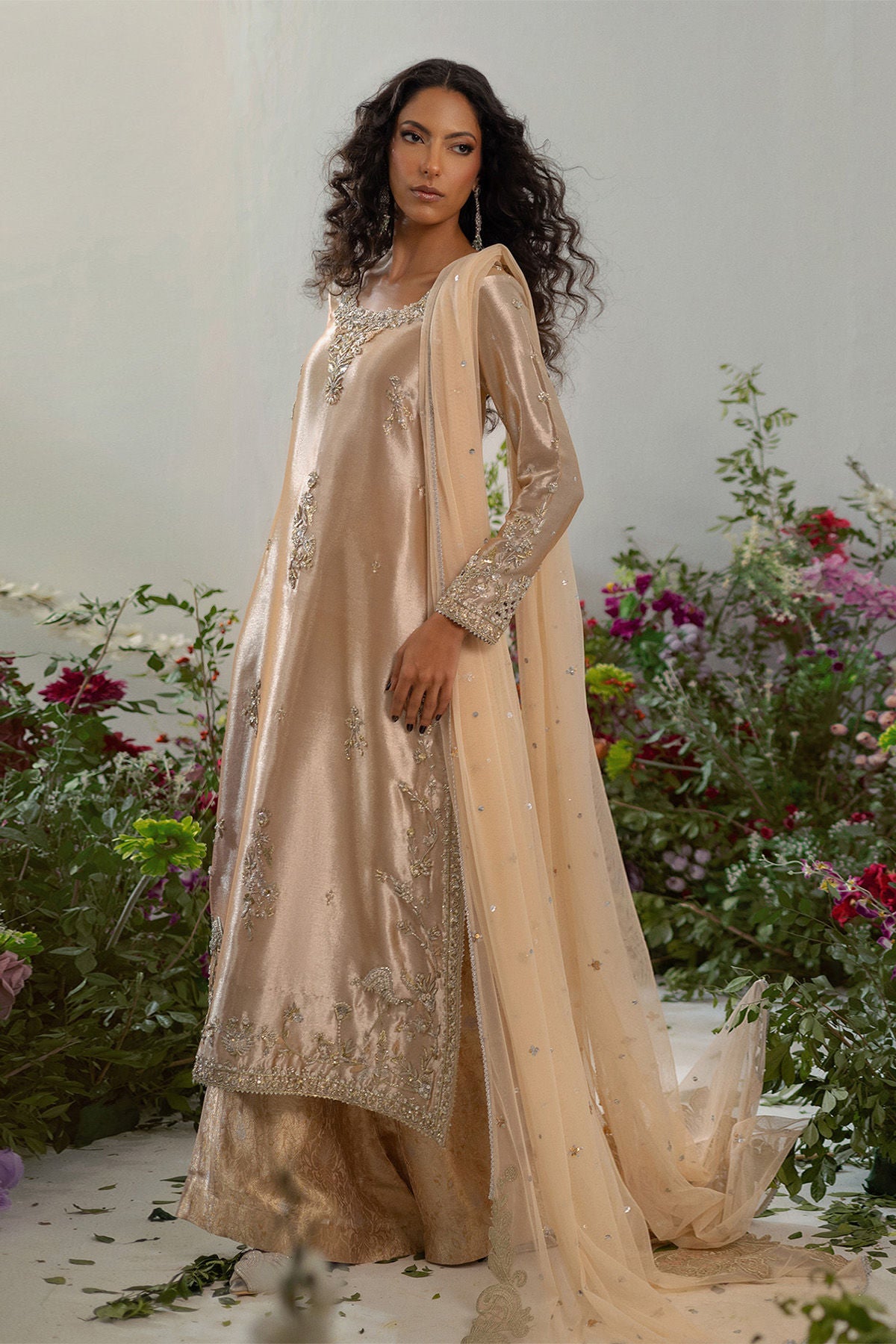 Elegant A-line shirt made of shimmering lamé fabric adorned with intricate silver and muted gold zardozi embellishments, accented with delicate pearls. The sleeves are beautifully crafted with cutwork detailing, perfect to be paired with damask dhaka and a net dupatta embellished with silver and gold sequins spray and zari appliqué embroidery on each pallu, making it a showstopper this festive season.