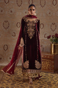 Old school details of antique and gold zardozi on deep maroon velvet canvas. The side slits of the shirt are adorned with zari details. The hemline is enhanced with zari appliqué motifs and the shirt can be paired with net dupatta featuring sequins and lace details. The outfit is accompanied by gold and antique izaar featuring gota details on hemline.
