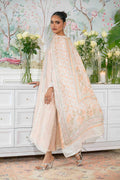Long silhouette shirt in an ethereal nude shade, embellished with intricately embroidered silk thread details adorned with zardozi and pearls. This exquisite shirt is accompanied by complimentary straight raw silk trousers and a printed silk dupatta, ensuring you stand out this festive season.