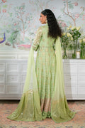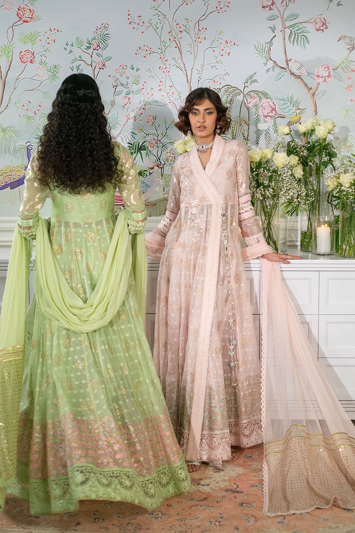 Floor-length angharka pishwas in a calming mint hue, showcasing self-embroidered resham embellishments on the bodice. The hem is enriched with hand block printed details and gota panels. The center front is elegantly adorned with handcrafted tassels. This ensemble is accompanied by complimentary straight raw silk pants and a chiffon dupatta, featuring a sequined panel on the pallu, finished with exquisite lace.
