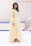 The "Baneen" ensemble in lemon and white is a vibrant and elegant choice. The lemon yellow straight shirt features anchor embroidery and hand embellishments in white, adding a touch of sophistication and style. It is paired with an ivory izaar adorned with floral bunches, enhancing the outfit's charm. The yellow organza dupatta with resham embroidery complements the ensemble beautifully, completing the look with grace and elegance.