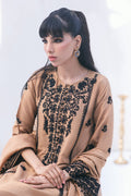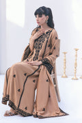 The "Cadie" outfit features anchor embroidery on a mocha raw silk base, creating a rich and textured look. The embroidery is complemented by handwork detailing, enhancing its overall appearance. It comes with a medium silk dupatta and straight pants, making it a stylish and sophisticated ensemble.