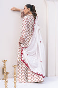 The "Cordelia" outfit features a discharge print on pure raw silk, creating a unique and elegant look. The A-line kurta is adorned with handwork detailing on the neckline and sleeves, adding a touch of sophistication. It comes with a pure medium silk printed dupatta and is paired with raw silk izaar, offering a graceful and stylish ensemble.