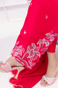 The dark pink kurta is a classic piece with modern elements. It features a straight narrow shirt with fitted sleeves, cutouts on the neckline, self-fabric buttons on the neckline and side seam, and shadow work on the hem with moti and kardana touching. The raw silk pant is straight with monochrome colors in embroidery, adding a stylish touch. The medium silk dupatta in dark pink features bootis, completing the ensemble with a chic and elegant finish.