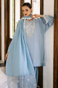 Ethereal Elegance: Periwinkle Perfection. This outfit embodies a vision of delicate beauty. The periwinkle short shirt, crafted with a relaxed drop shoulder silhouette, boasts a captivating neckline detailed with white embroidery. Farshi shalwar complements the flowy drape of the shirt, while a luxurious dupatta crafted from organza and medium silk adds a touch of ethereal dimension.