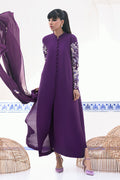 This deep purple classic sherwani-style shirt exudes elegance, featuring exquisite gara embroidery on the sleeves. The shirt is paired with straight raw silk pants and comes with a medium silk dupatta, creating a regal and sophisticated ensemble.