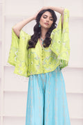 The lime green cape is a statement piece with raw silk appliqué on lime green organza with cutouts, sequin, stone, and moti touching, along with moti and stone tassels on the cape edges. The aqua wide-leg panel jumpsuit features ivory machine embroidery with white moti and lime green kardana touching, adding a touch of elegance. Both pieces are made from raw silk, creating a stunning and sophisticated look.