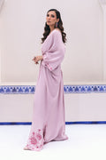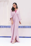 This pink kaftan is a bold and glamorous choice. The raw silk kaftan features an exaggerated silhouette in shades of pink, adorned with shadow work embroidery for a stunning effect. It is paired with a bandeau top embellished with chunky Swarovski stones on the straps, adding a touch of sparkle and sophistication to the ensemble.