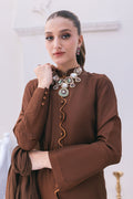 The "Sepia" design is a sophisticated and elegant ensemble. The sherwani-style kurta features straight sleeves, a sherwani collar, and a wavy cutwork placket with stitch lines in the sleeve cuffs. It has a slit with buttons and is solid chocolate brown with caramel embroidery/outline on the wavy placket and caramel stitch lines on the sleeve, adding a touch of style. The pant is culottes in chocolate brown with a wavy cutwork hem with caramel outline, made from raw silk. The dupatta is chocolate brown, made from medium silk, with stitch lines on the top and bottom in caramel, completing the ensemble with a refined and graceful finish.