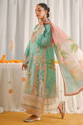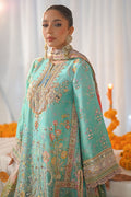 A sophisticated ensemble inspired by the serene beauty of Persian rugs. The turquoise hue, accented with pops of orange and yellow, creates a visually striking yet harmonious palette. The multi-layered design, featuring delicate blush pink borders, adds depth and texture to this elegant piece.
