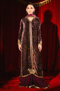 This regal purple discharge front-open sherwani showcases intricate gota handwork that adds a touch of classic opulence. It is paired with a crushed Dhaka dupatta crafted from medium silk, featuring self block print and finished with delicate gota edging — creating a refined look that beautifully blends tradition and sophistication.