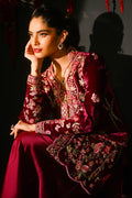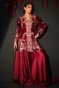 This striking magenta ensemble features a short front-open velvet jacket adorned with resham embroidery and intricate hand embellishments. The puffy sleeves add a touch of drama, while delicate floral and butterfly motifs bring a whimsical charm. Paired with flared sheesha silk pants, the look exudes contemporary elegance with a playful, feminine edge.