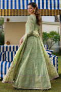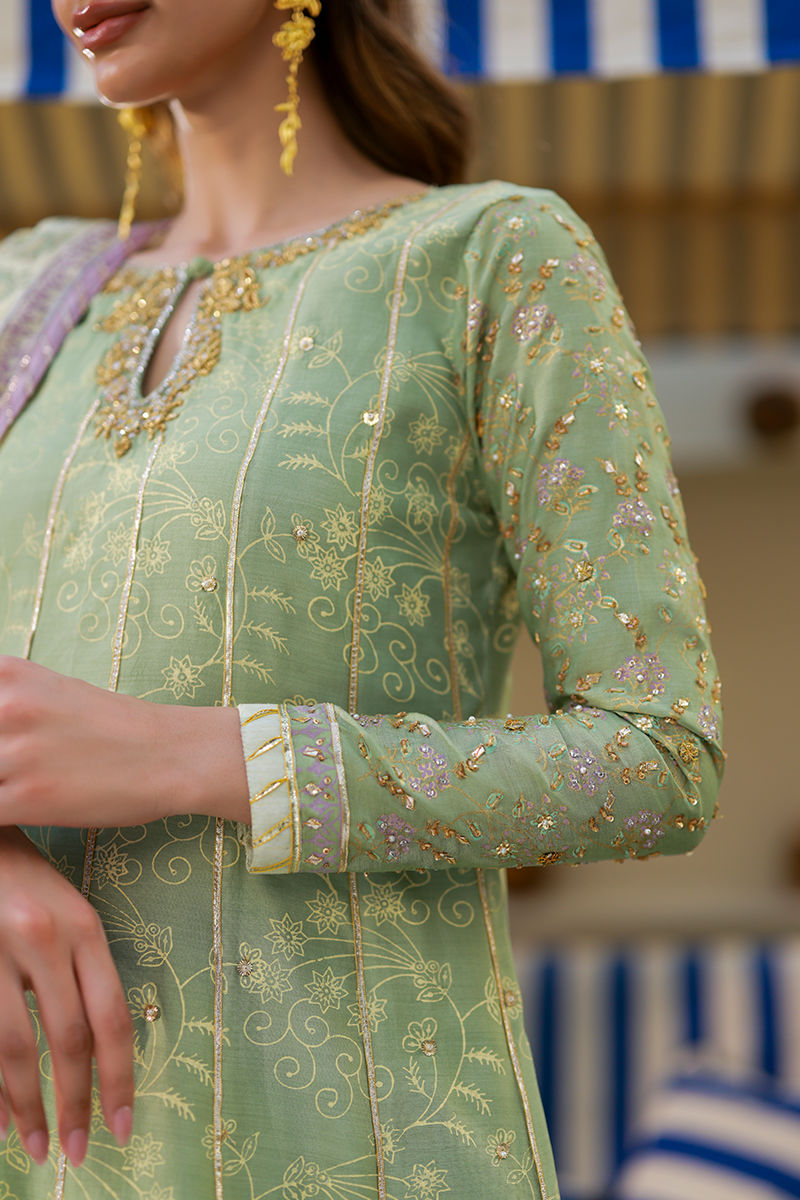 A sage khadi silk kalidar with a keyhole neckline, hand-embellished details, and fitted sleeves, adorned with subtle gold block print and gota accents. Paired with a medium silk dupatta featuring block print gota work and delicate lace detailing, this ensemble exudes timeless elegance and artisanal charm.