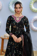 A black khaddi silk kalidar with a keyhole neckline and fitted sleeves, adorned with intricate screen print, lace, and gota accents. The hand-embellished neckline adds a touch of artisanal charm, paired with crushed dhaka featuring delicate lace detailing and a block-printed organza dupatta, creating a refined and sophisticated ensemble.