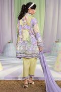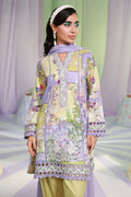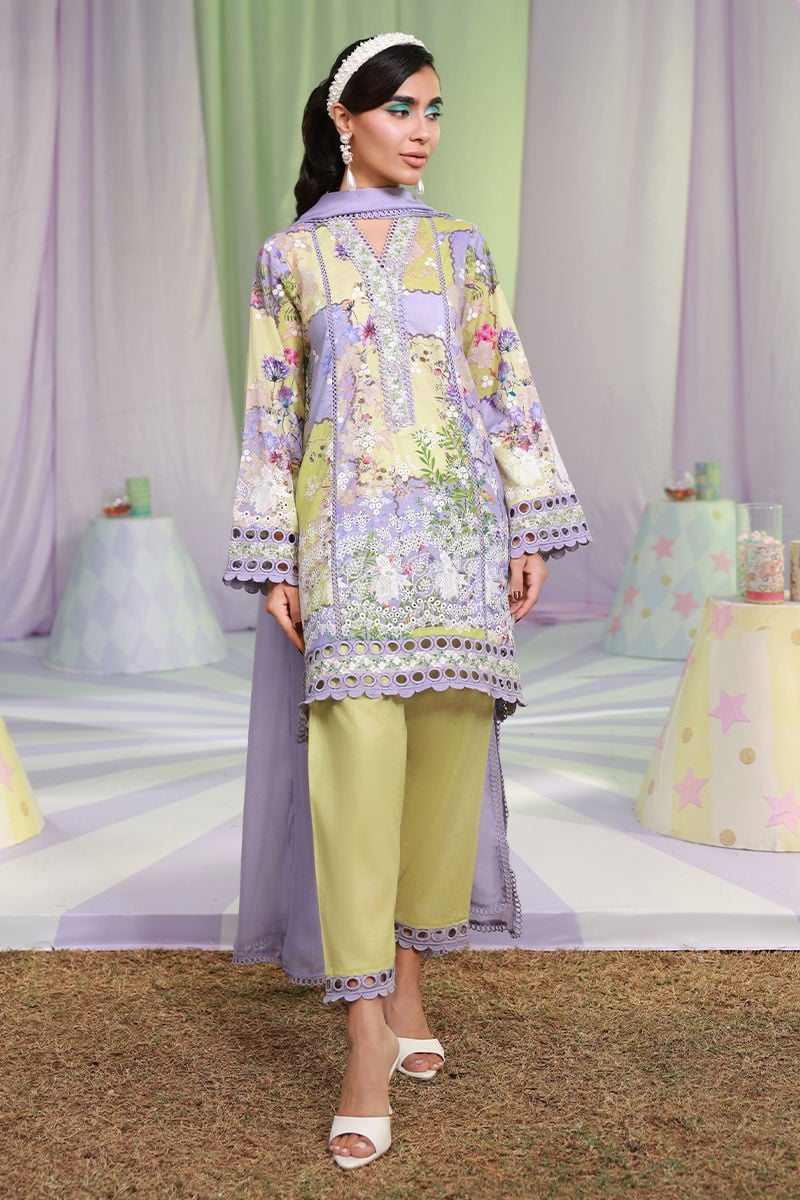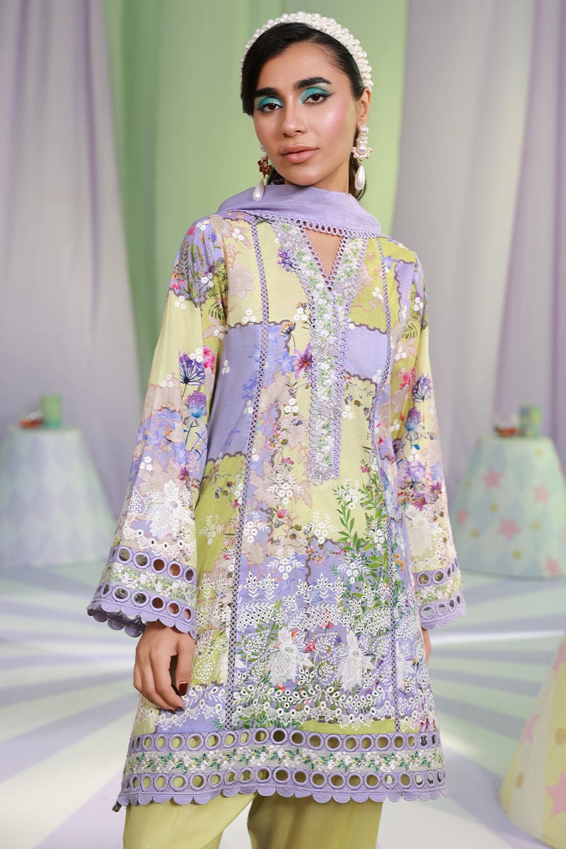 A short schiffli kurta in a delicate lilac and mint print, adorned with intricate cutwork lace and embroidery on the neckline, sleeves, and hem. Paired with a mint green shalwar featuring lilac color block lace, and complemented by a medium silk lilac dupatta with refined lace edging.