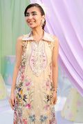 A Long butter-yellow printed shirt featuring an embroidered collar with lace accents and heart-shaped buttons, complemented by delicate lace and pastel embroidery along the hem. Paired with a medium silk butter-yellow azhaar and a matching silk dupatta with lace edging, creating a soft and elegant ensemble.