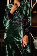 An exquisite emerald green velvet wrap top adorned with cherry blossom–inspired embroidery, enriched with delicate hand embellishments featuring cutdana and sequins for a soft, lustrous shimmer. Subtle purple accents enhance the design, adding a refined pop of contrast, while the notch collar lends a tailored, contemporary touch. Paired with velvet boot-cut pants, this ensemble blends opulence with modern sophistication—perfect for making a graceful yet striking style statement.