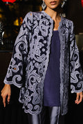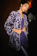 A short open-front velvet jacket adorned with sheesha silk appliqué and intricate baroque motifs, finished with delicate cutwork. The rich dark-purple base is beautifully contrasted with lilac appliqué, paired with a crepe slip and sheesha silk flared pants for a look that’s opulent, modern, and effortlessly striking.