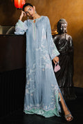 A flowing kaftan silhouette brought to life with delicate pastel Sakura motif embroidery, enhanced with hand-touched crystal stone detailing for a soft, ethereal sparkle. The design features elegant sage green color-blocking that adds a modern contrast, while embellished butterfly tassels adorning the slits lend a whimsical, graceful charm. An effortlessly chic statement piece perfect for refined festive or resort wear.