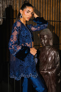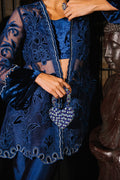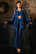 A statement navy blue organza jacket adorned with rich velvet appliqué and finished with shimmering silver Swarovski embellishments, creating the perfect balance of texture and sparkle. Paired with sleek sheesha silk wide-leg pants, this ensemble exudes contemporary elegance with a touch of glamour—ideal for evening occasions where sophistication is key.