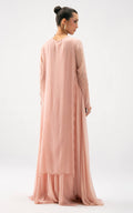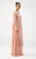 Breathe timeless elegance into your wardrobe with this soft peach ensemble, crafted for women who cherish sophistication in simplicity. Subtle yet captivating, it is a celebration of understated glamour and refined style. The long flowing dress is designed in a delicate chiffon peach tone, beautifully embellished with hand embroidery in silver zari, sequins, and pearls. The intricate detailing along the neckline and hem adds a graceful shimmer, while the soft fabric drapes with fluidity, exuding effortless charm. Ideal for daytime festivities, receptions, and elegant evening gatherings, this outfit radiates an aura of serenity and sophistication.